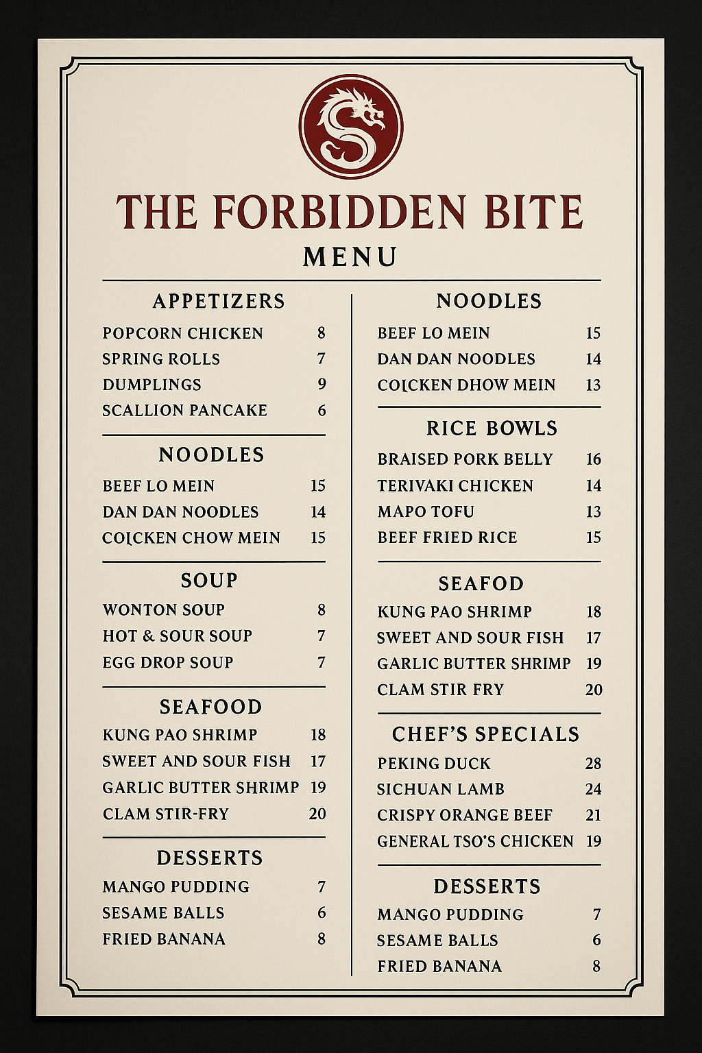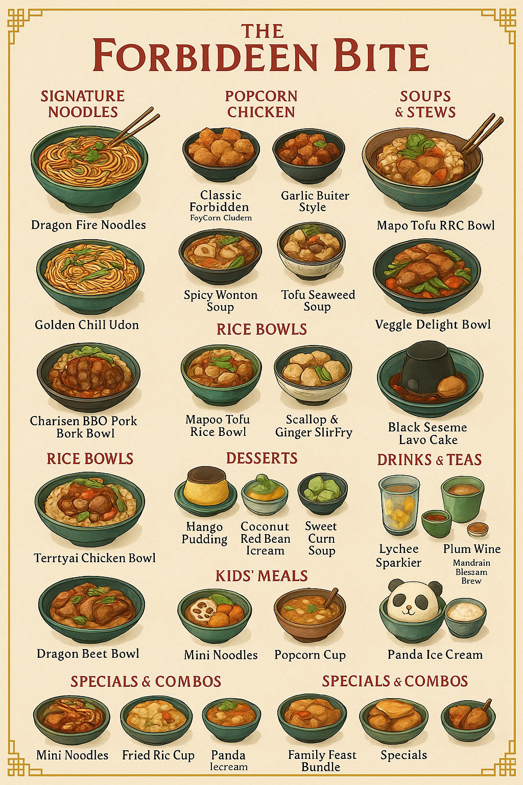 Founded by Lucas, Daniel, and Wesley, our restaurant brings the Forbidden Bite collection to life — a blend of warmth, family spirit, and a touch of luxury. Every dish, from hand-pulled noodles and golden popcorn chicken to nourishing soups, colorful rice bowls, and fresh seafood, is crafted for both comfort and celebration.